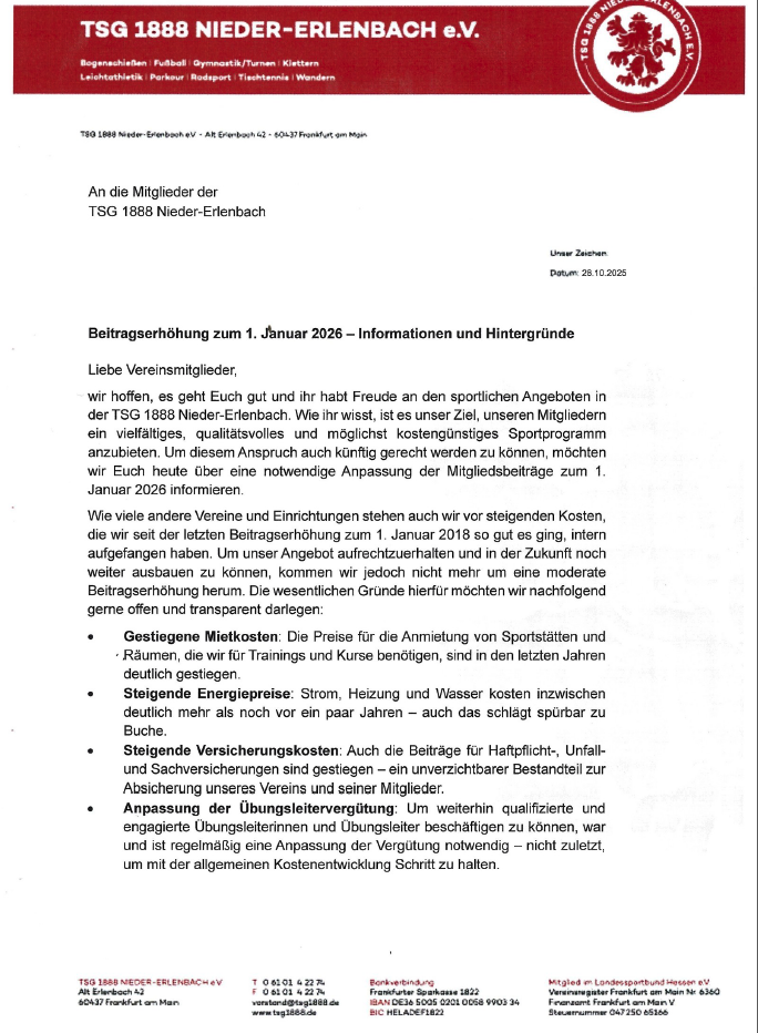 Auch ein Sportverein wie die TSG 1888 Nieder Erlenbach e. V. bleibt von steigenden Kosten und erhöhten Aufwänden leider nicht verschont. Um weiterhin unsere über zehn unterschiedlichen Sportangebote aufrecht zu halten, werden wir die Beiträge ab dem 01. Januar 2026 moderat anpassen. Lest bitte dazu dieses nebenstehende Schreiben. Herzlichen Dank für euer Verständnis.